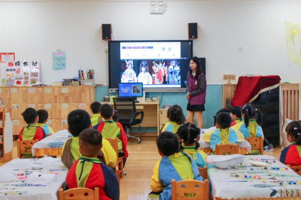 活动伊始,艺术姐姐团队成员对脸谱的起源和发展历程做了详细的介绍,用通俗易懂的语言让孩子们对脸谱的分类、特点、颜色、图案有了更直观的了解。同时通过图片、动画和互动问答的方式让孩子们认识到脸谱代表的角色以及不同脸谱颜色所反映的人物性格。