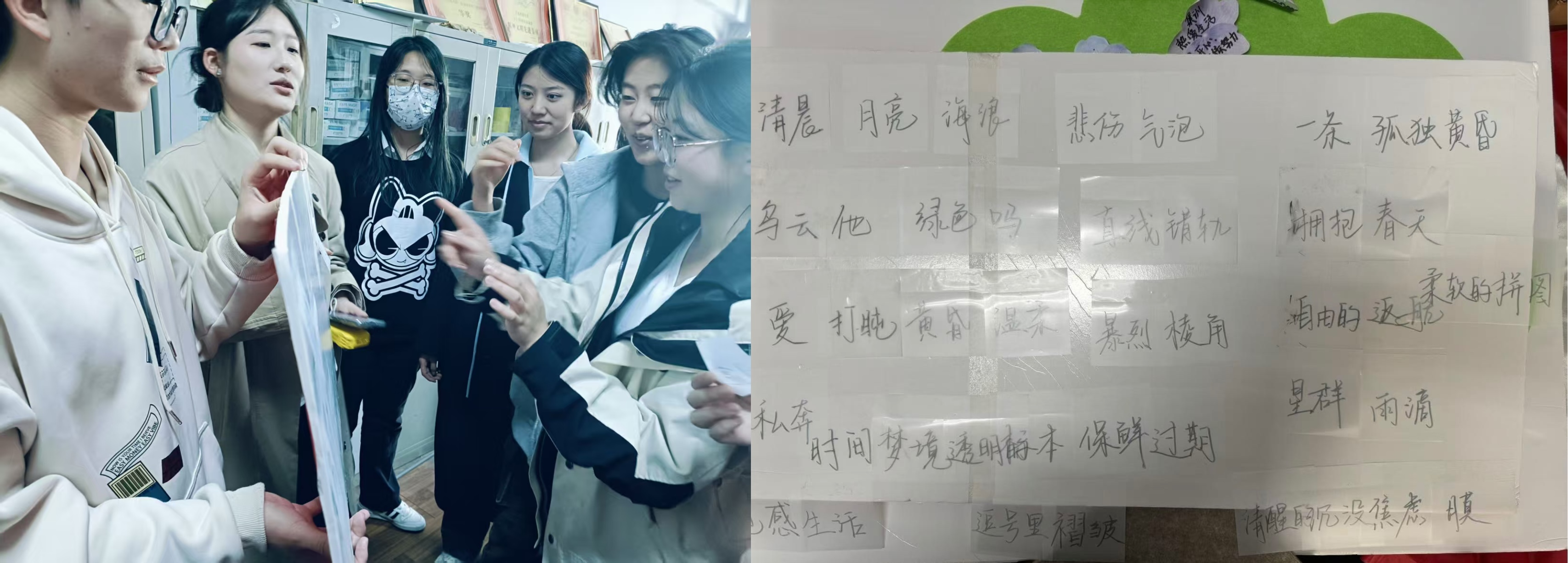 在“精神状态be like”拼贴诗工坊活动中,同学们从“名词/动词/意象”托盘中随机选取词语卡片,突破语法和逻辑限制,创作出风格各异的短诗并展示出来。活动过程中,主持人用启迪心灵的精彩串场词为活动增添了人文色彩,启发同学们的思考与感悟,帮助大家释放内心的压抑与焦虑情绪。
