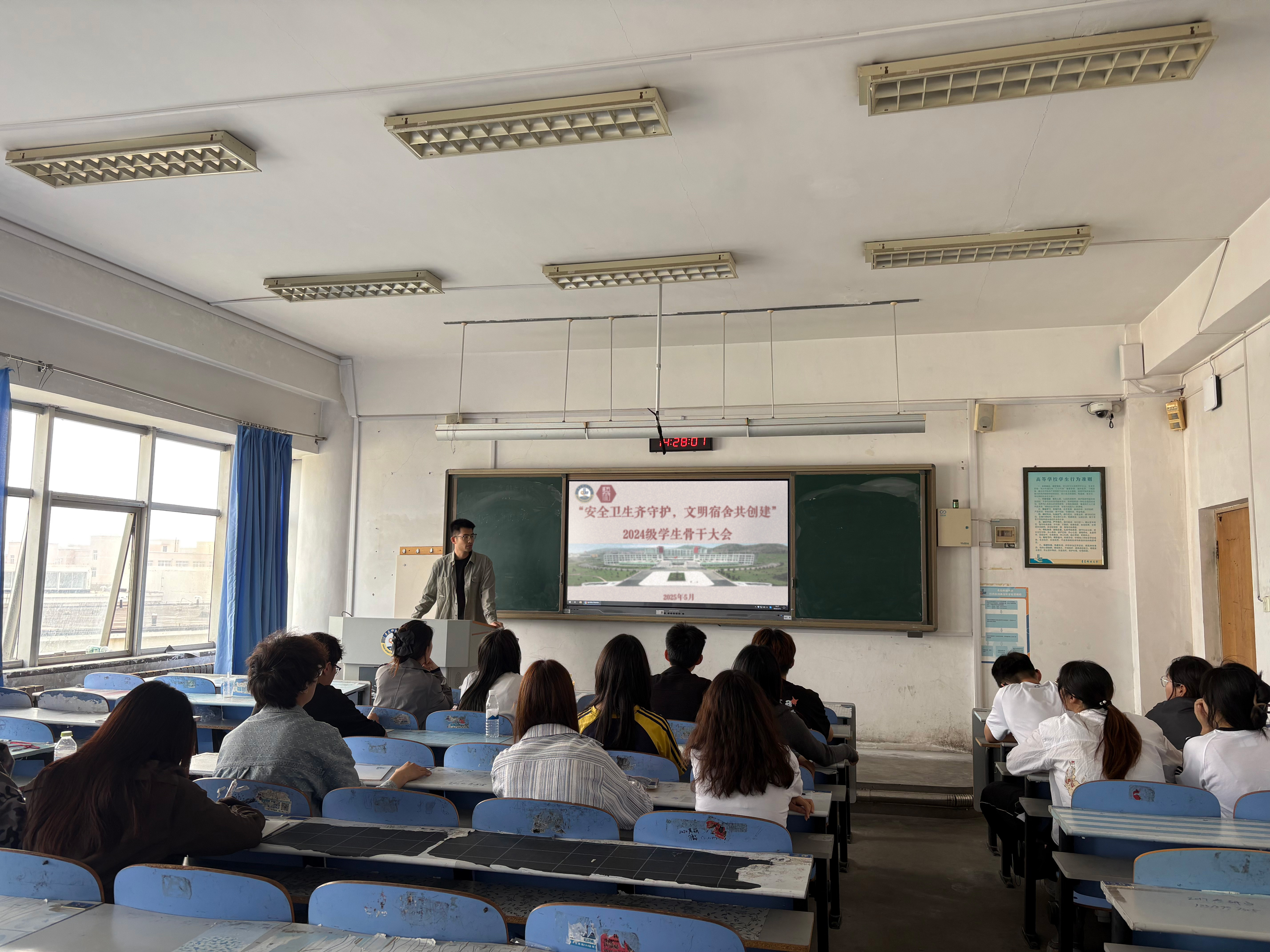 组织2024级本科生各班级开展“宿舍卫生、安全”主题班会。会议由辅导员杨橙、各班班委主持,全体学生参加。