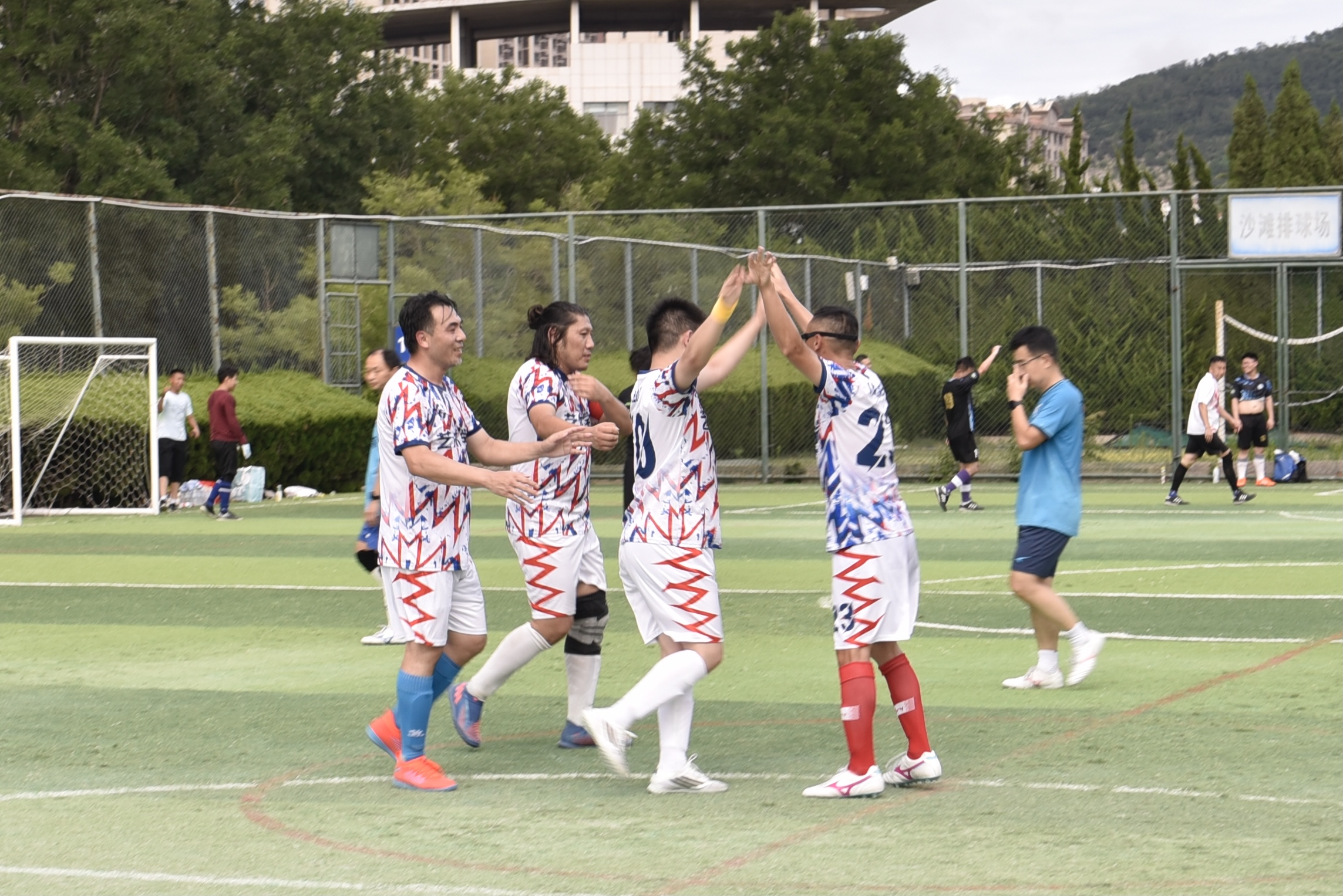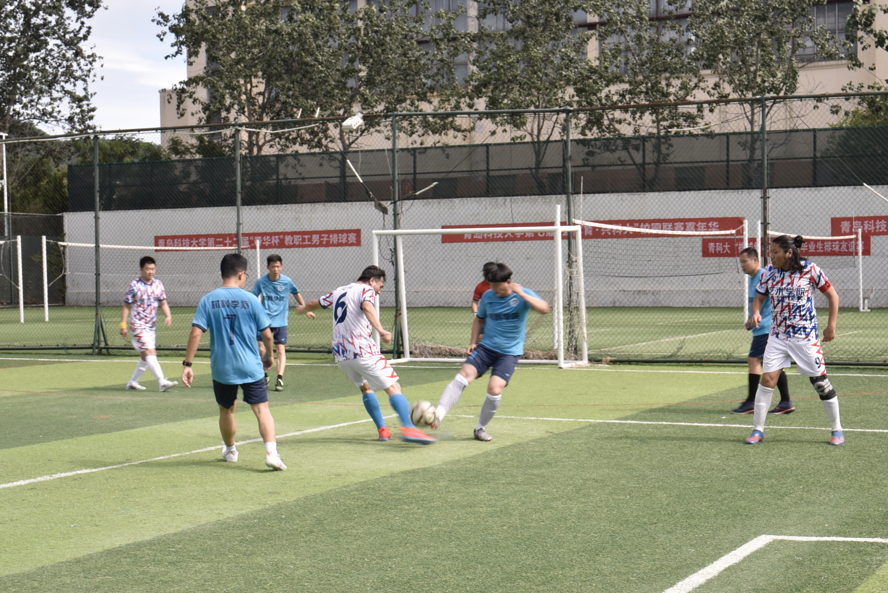 进入决赛。在决赛中,老师们在先失一球的不利局面下,克服高温天气,奋勇拼搏、积极跑动,场上场下一条心,相互鼓励支持,通过灵动的跑位、巧妙的传球、精准的射门,接连打进3球,最终以3:1的比分战胜高分子大赢家比分