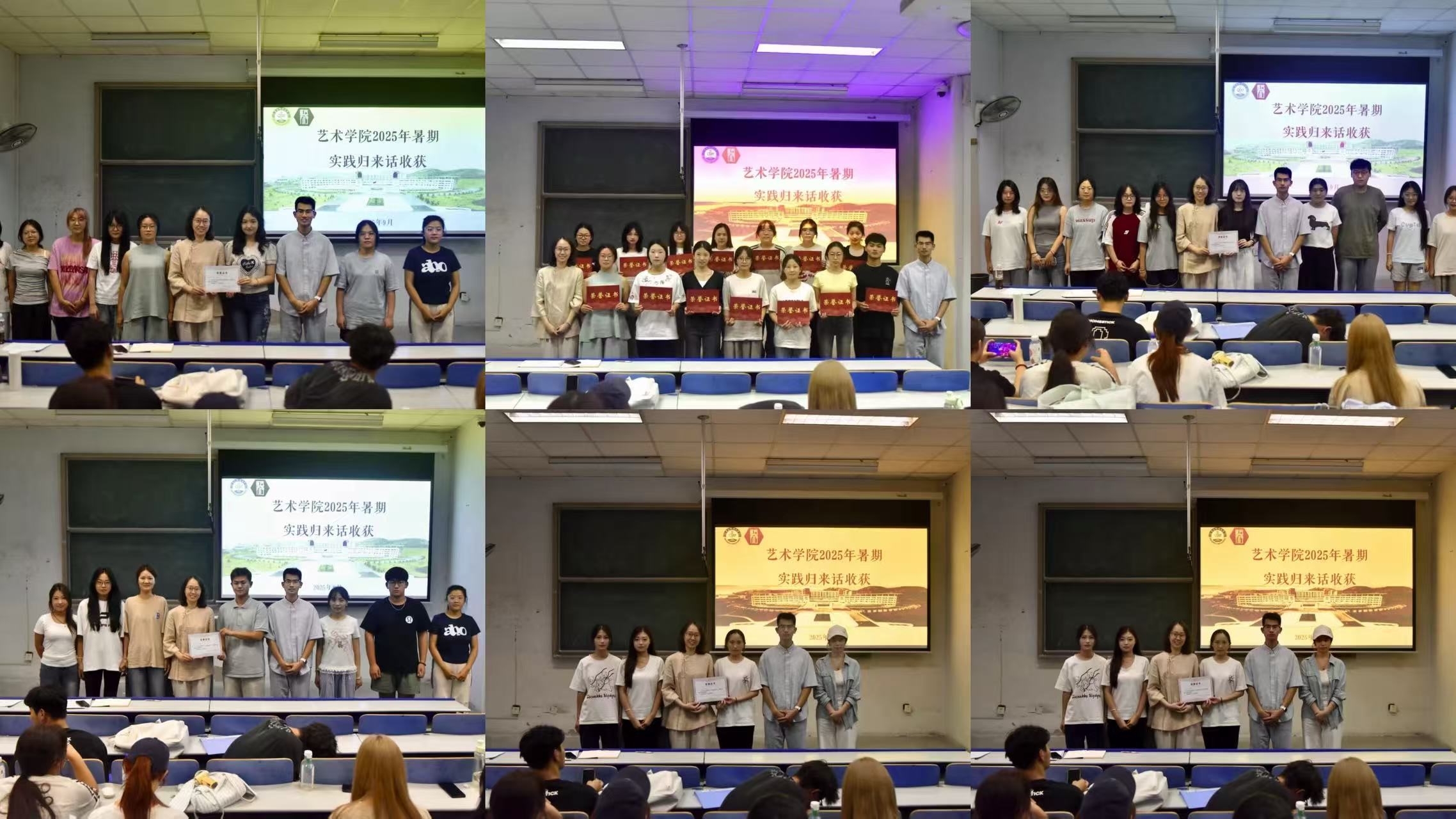 丁一宁为优秀实践团队及个人颁发荣誉证书,对大家在暑期社会实践中展现出的责任担当与专业素养给予高度肯定。她在总结讲话中强调,社会实践是检验学习成果、锤炼综合能力的重要平台,希望全体学子以此次分享为契机,持续将艺术专业优势与社会需求相结合,在实践中坚定理想信念、提升专业水平,用艺术力量服务社会发展。