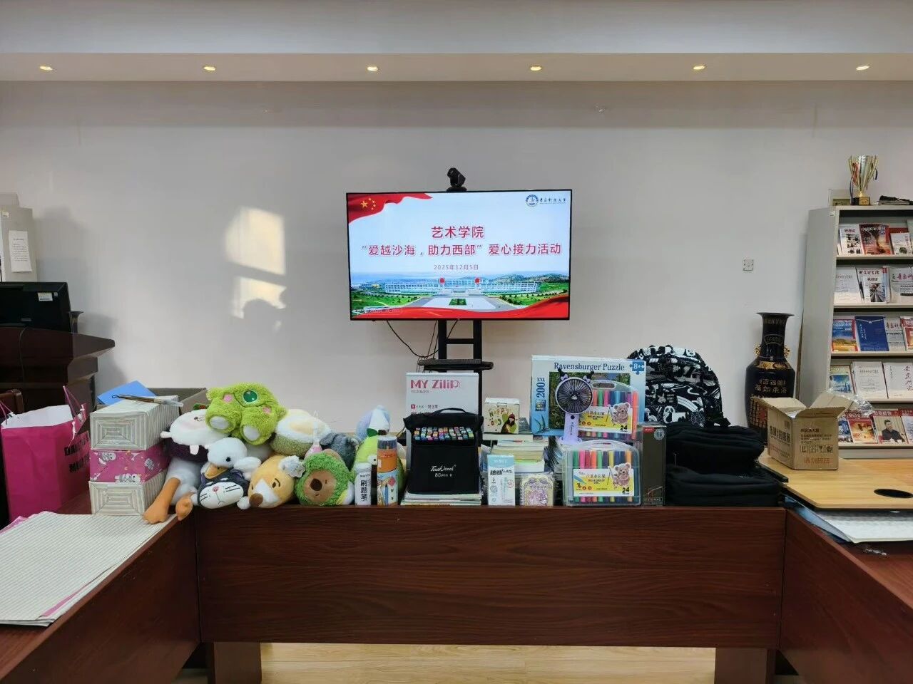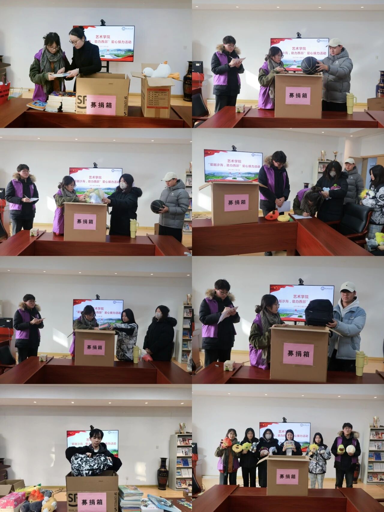 领导率先垂范,精心挑选实用物资;各年级学生积极响应,纷纷携带书本、文具、画材、体育用品等前来捐赠。现场气氛热烈,师生踊跃参与,展现出高度的公益热情与社会责任感。