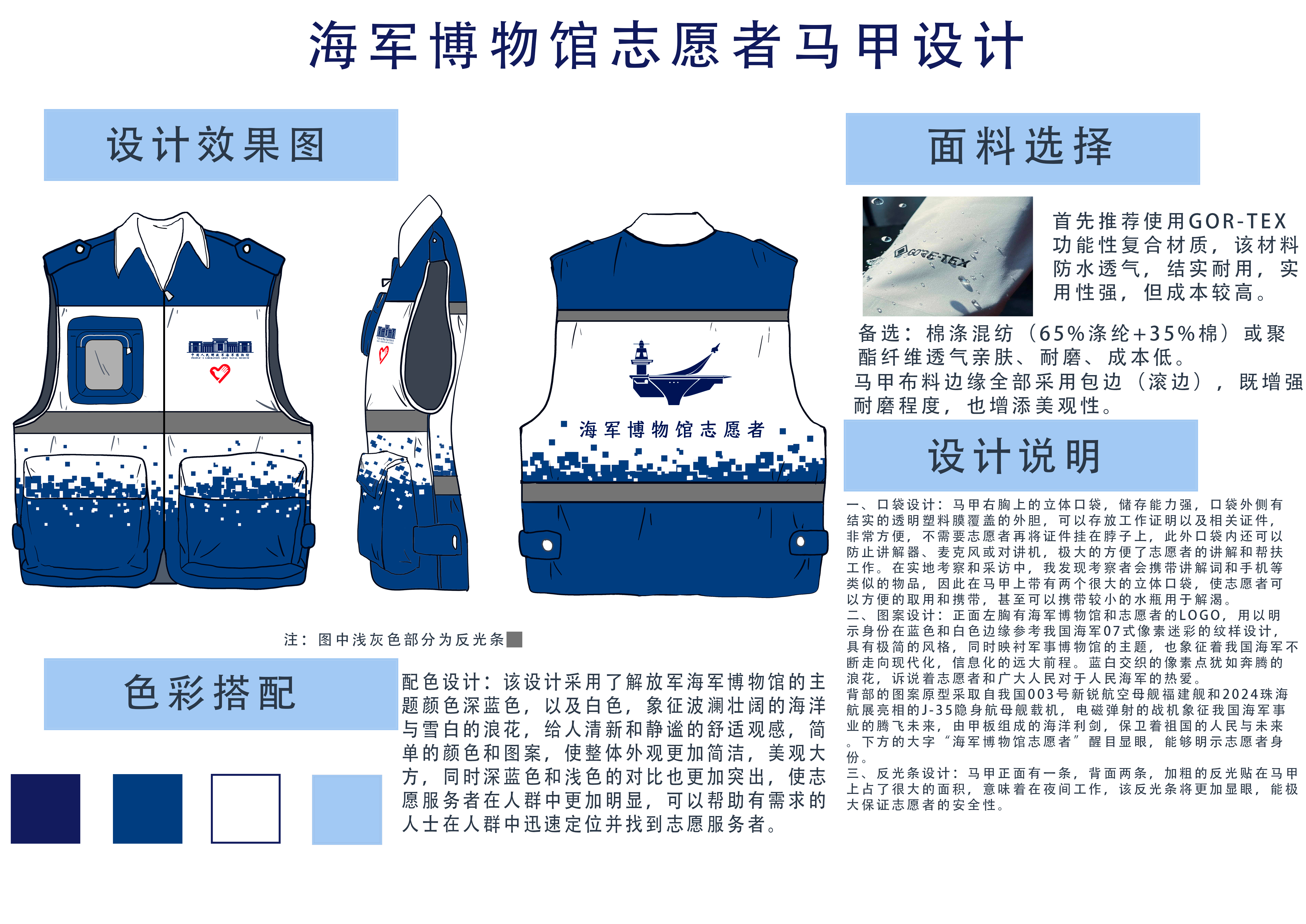 众多青年学生的积极参与,同学们凭借扎实的专业素养,将内心对人民海军的崇高敬意融入创意,与海军文化深度交融,精心勾勒出一件件饱含深情的志愿者马甲。在设计作品中,海军元素十分亮眼,每个细节都传递着对人民海军的无限敬意。有的用海军经典蓝白色调,配上象征海洋力量的波浪线条;有的巧妙把海军军旗、军舰等标志性元素融入图案,极具视觉冲击力,尽显海军文化内涵。