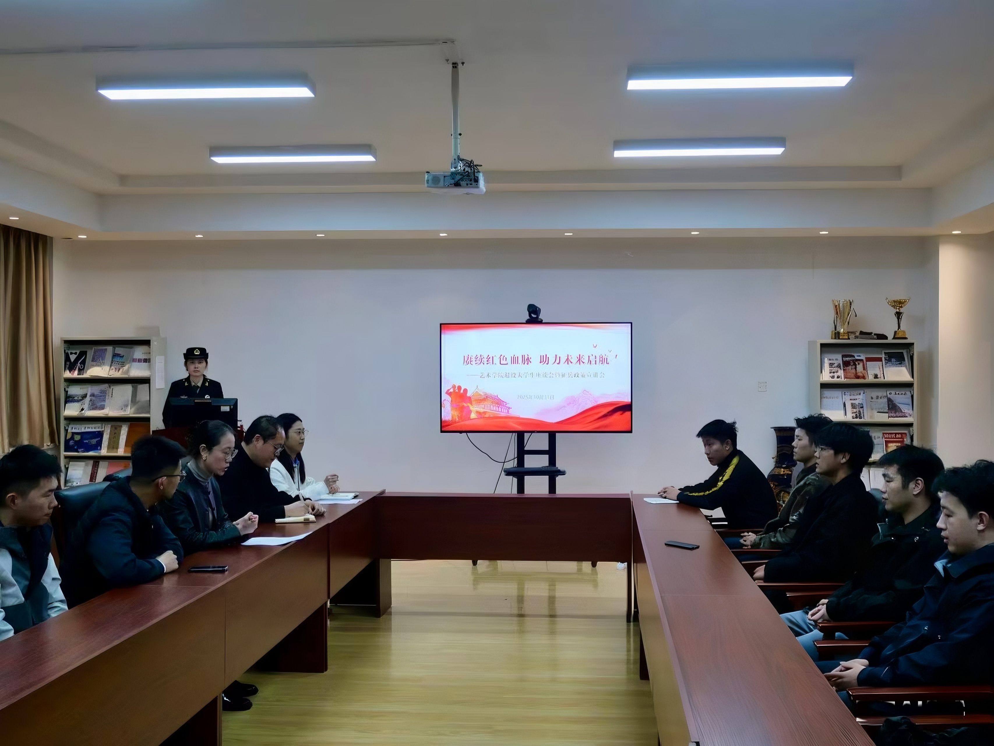 党委副书记兼副院长丁一宁、各年级辅导员、退役大学生士兵代表、有意向应征入伍的同学共同参会。
