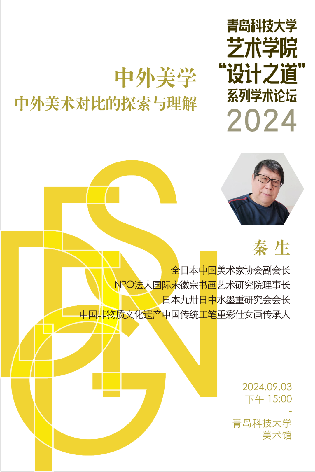 “设计之道”系列学术论坛活动之一,此次讲座特邀了享誉海内外的艺术家秦生先生担任主讲,秦生先生以其渊博的学识和丰富的艺术实践经验,从历史的长河、哲学的深度到艺术的广度,多维度、多层次地剖析了中外美术的特色与演变历程,秦生先生目前为全日本中国美术家协会副会长,NPO法人国际宋徽宗书画艺术研究院理事长,日本九州日中水墨重研究会会长,中国非物质文化遗产中国传统工笔重彩仕女画传承人。