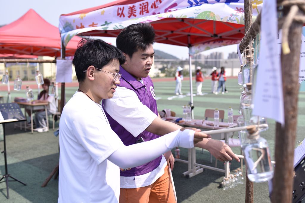 特色文化和中华优秀传统文化,精心打造德智体美劳五大主题体验区,推出14项特色活动,使同学们在互动体验中实现心理成长与文化浸润的双重收获,达成“寓心于乐,润心无声”的育人效果。同学们在沉浸式艺术创作中以美润心,滋养心灵之花绽放;在香囊制作中以劳健心,感受传统手作温度。