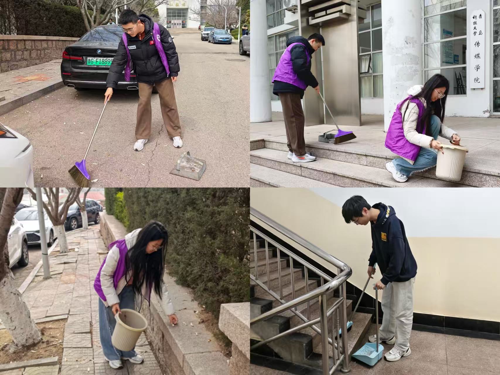 提前规划分区、明确分工,准备好扫帚、簸箕等工具,志愿者们迅速集结,满怀热情投入劳动。活动现场,志愿者们分工协作、干劲十足,对教学楼周边道路、绿化带、公共区域等进行全面清理:大家弯腰清扫落叶杂物,仔细擦拭公共设施,有序整理乱停非机动车,不放过任何卫生死角,不怕脏、不怕累,用双手扮靓校园。