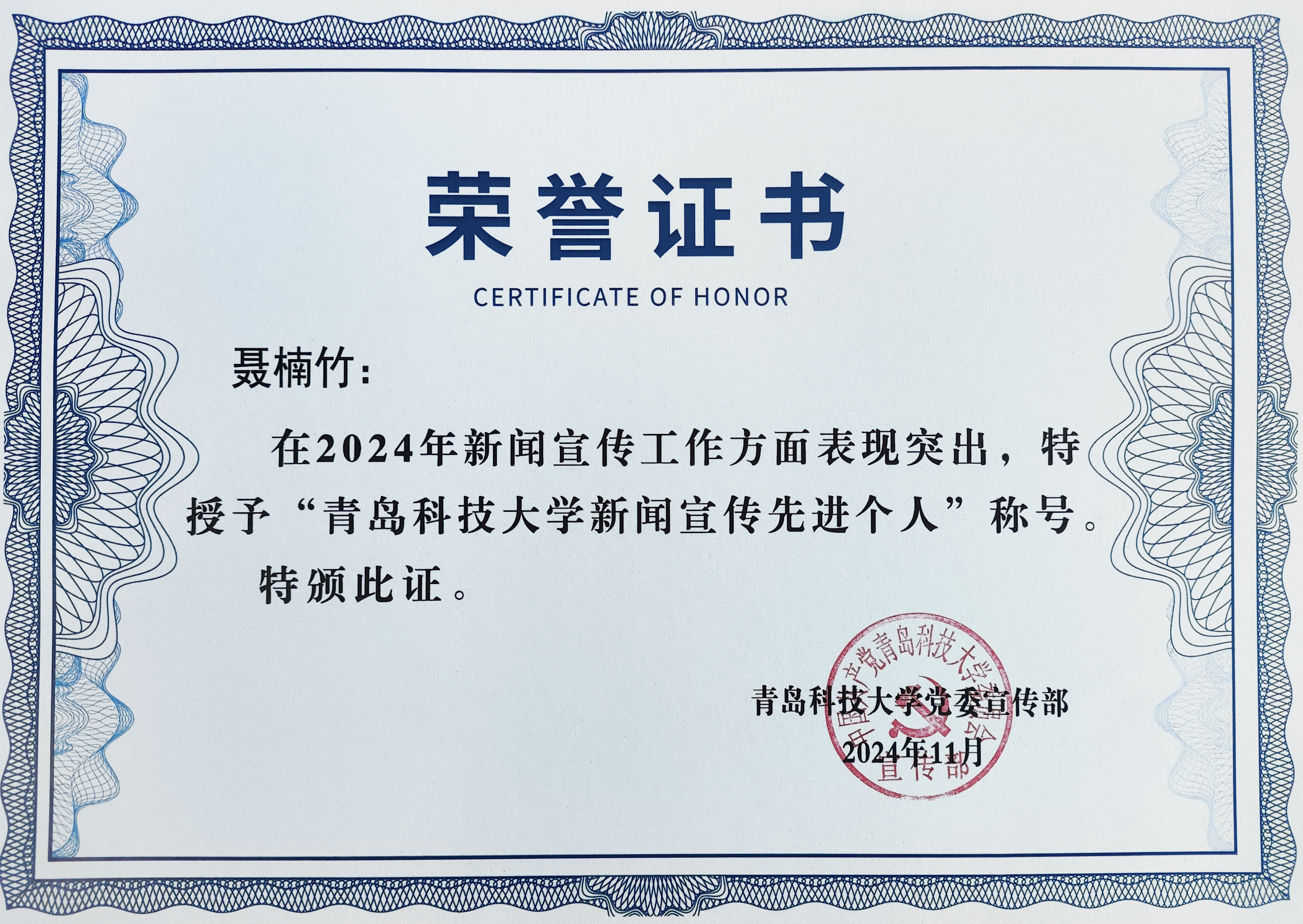 宣传干事聂楠竹获评2024年度新闻宣传先进个人。