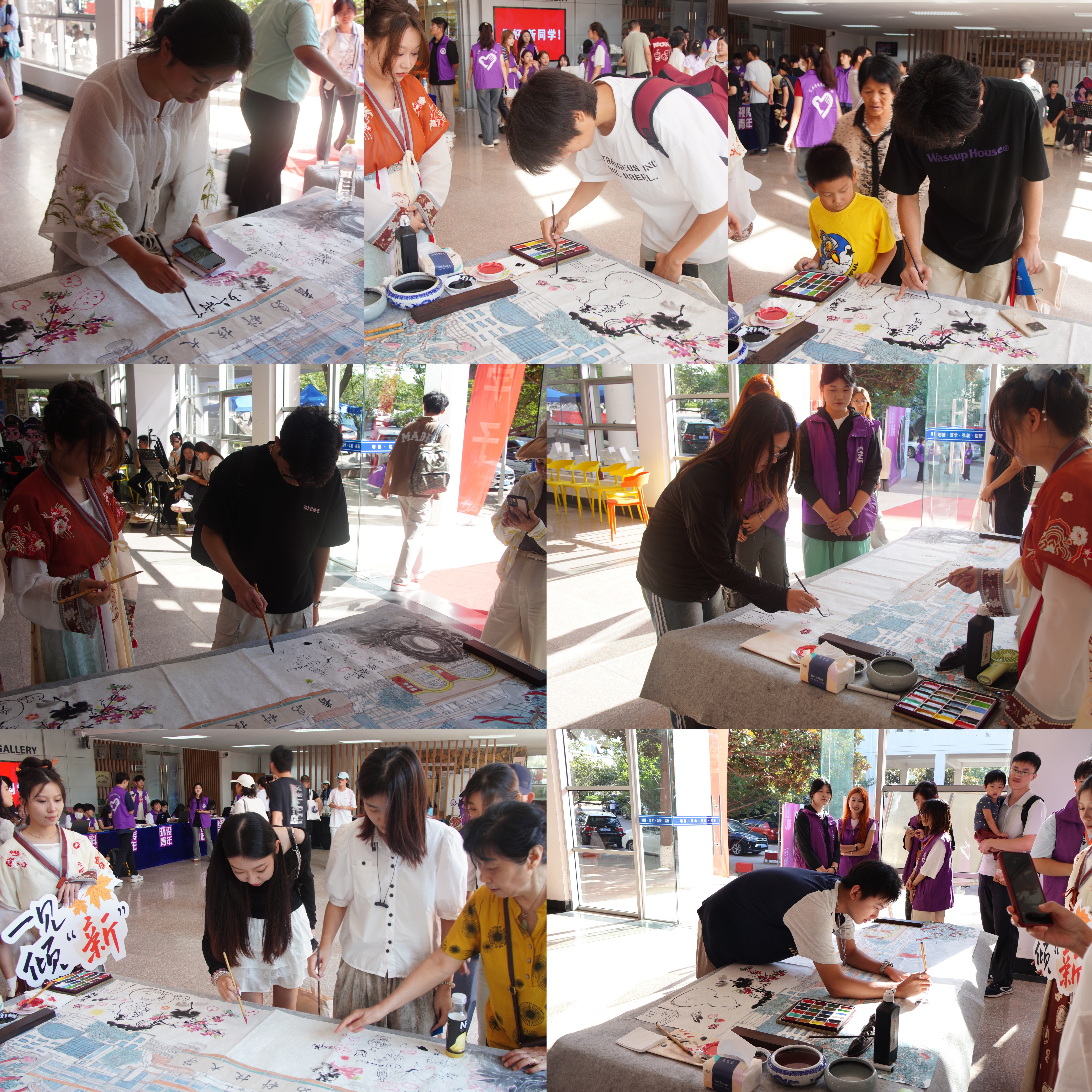 大型书画,传承创新。大型书画作品“门们”的创作过程也让新生们感受到了艺术的传承与创新。这幅作品由老生起稿,24级新生接续绘制,寓意着新老传承、共创辉煌的深厚意义。新生们在这里不仅学到了艺术技巧,更领悟到了艺术的精神内涵。