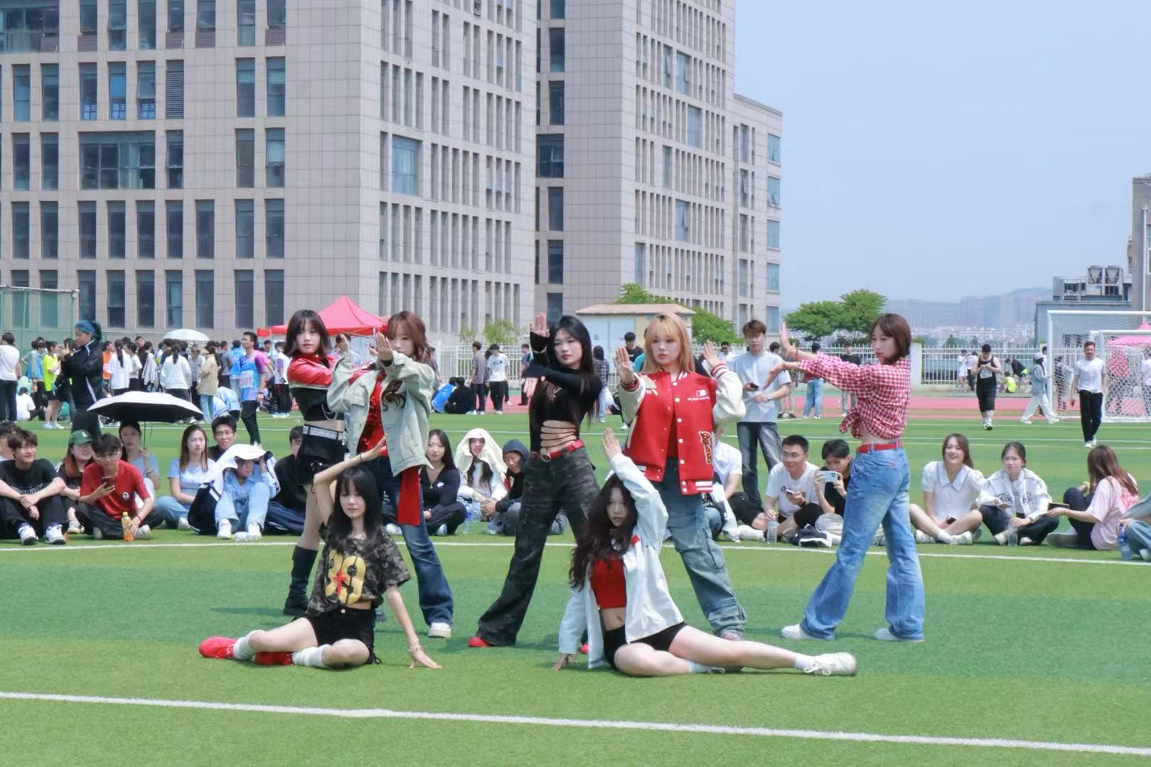方队迈着整齐步伐入场。队员们巧用心思,部分同学cos世界名画人物,经典造型与运动场景碰撞出艺术火花;另一部分则化身“春晚机器人”,以机械感动作和科技风造型吸引目光,方队行进间创意十足,赢得观众席阵阵掌声。随后的广播操表演中,同学们动作规范划一,展现出扎实的训练功底与青春朝气。中场时段,一段活力的舞蹈表演登场,让体育精神与艺术美感自然交融,将开幕式氛围推向高潮。