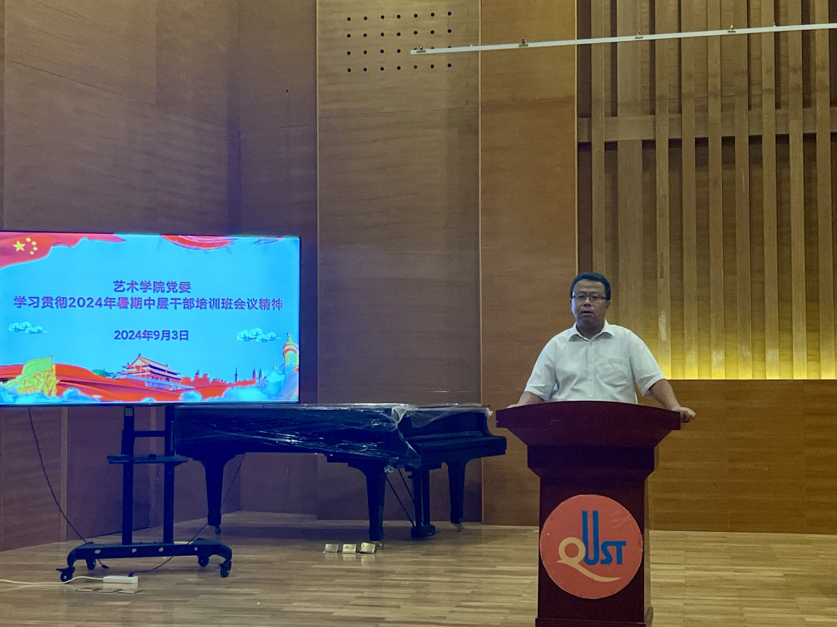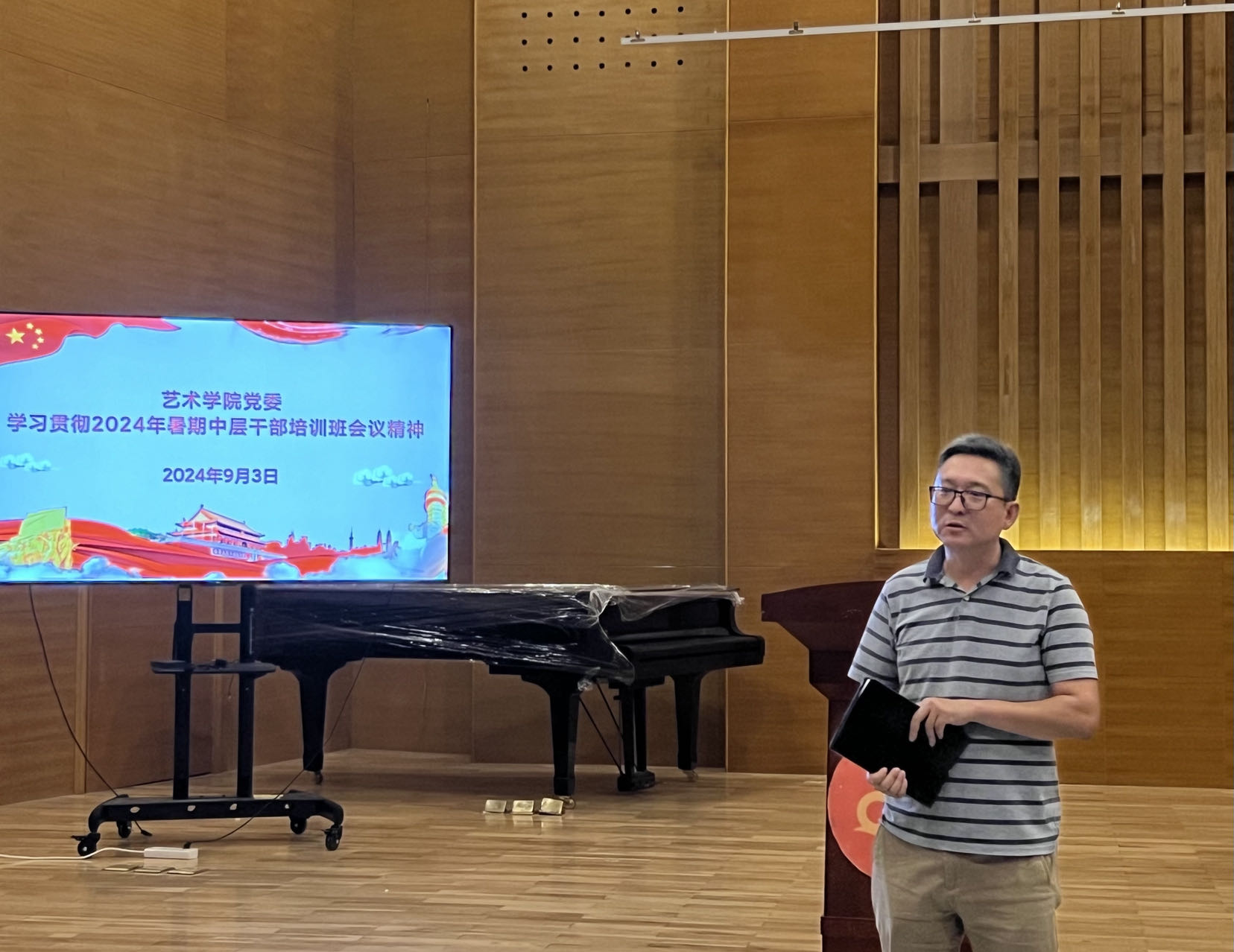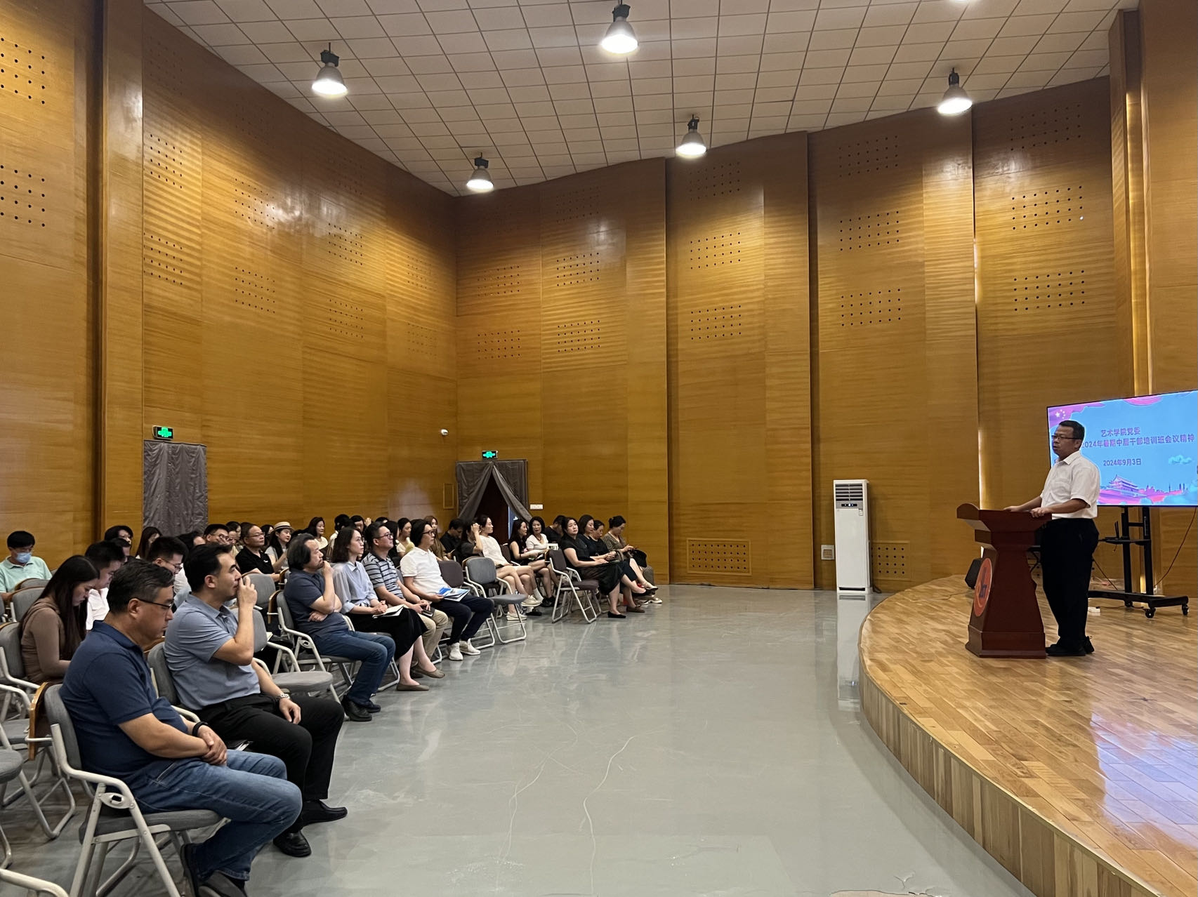 9月3日,大赢家比分 于音乐厅召开全体教职工大会。大赢家比分 院长李宏文,党委书记刘庆,副处级组织员曲波,副院长兼副书记丁一宁,副院长禹青、勾锐等大赢家比分 领导班子成员及全体教职工共同参加会议。会议由刘庆主持。