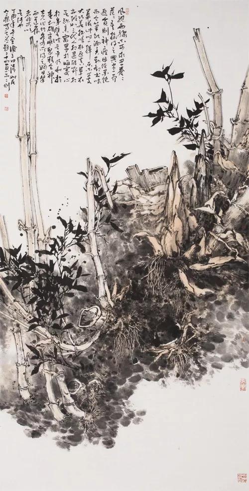 中国画创作应该是“遗去机巧,意冥玄化,而物在灵府,不在耳目”。故创作的最佳情状是“得于心,应于手,孤姿绝状,触毫而出,气交冲漠,与神为徒”(符载《观张员外画松石序》)。这实际上是告诫画家在创作上既要深入内里,究其本质。但又不可目为物蔽,心被法拘,创作的最终指归是超越表象,上达一个更高的精神境界,即追求心智与大道的冥合化一。善思慎行的田根承对这一点自然是深有会心。他认为一个画家如果只是把写生来的画稿,经过所谓的取舍加工而再现于画面,刻画得细致逼真,这在当下没有任何意义。以现代的审美意识和审美情趣,以自己的主观精神和创造意识,探索属于自己品格,是他所孜孜以求的。